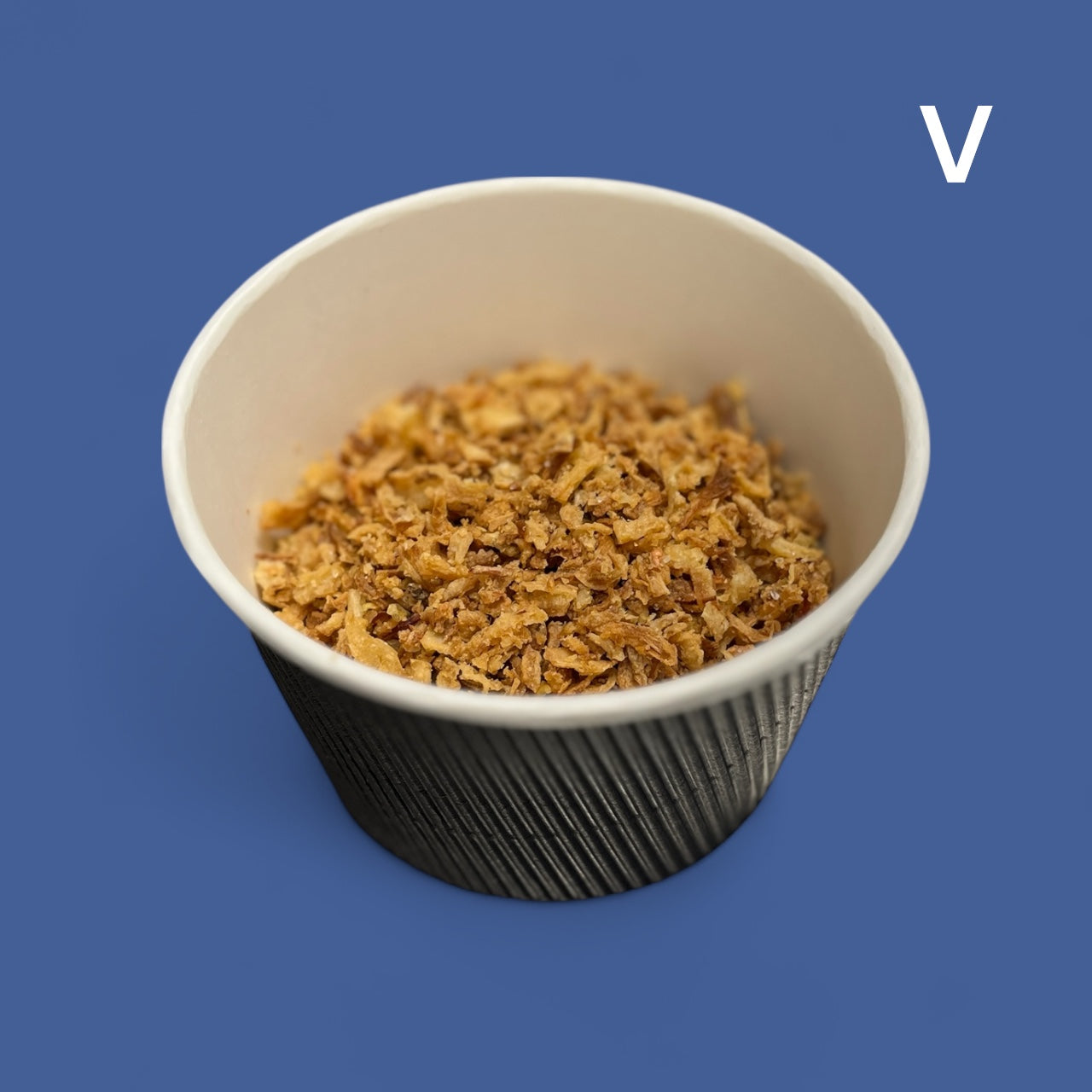 A large pot of crispy fried onions, perfect topper for your sushi.