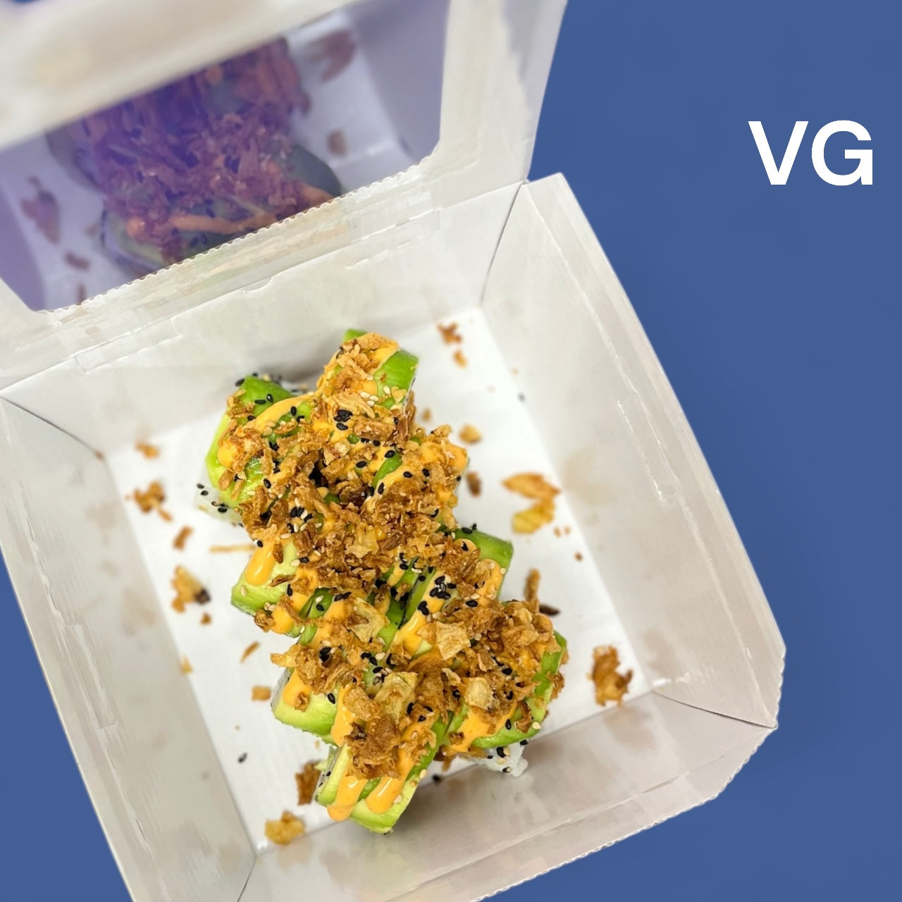 A roll filled with tempura sweet potato, lettuce, topped with avocado, spicy mayo and sesame.